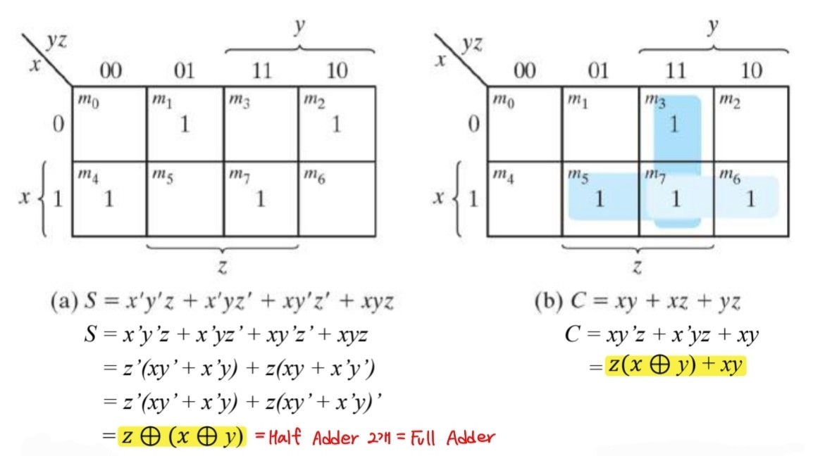 디코더는 n개의 입력으로 2^n개의 최소항을 제공하므로, 디코더와 OR게이트를 연결하면 반가산기나 전가산기의 sum과 carry에 대한 진리표와 불함수를 작성했던 것 처럼 같은 결과를 얻을 수 있다.