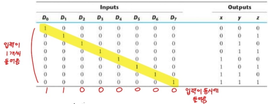 8 to 2 인코더에서 입력은 8개이고 입력조합은 모두 2^8개이다. 위의 진리표에서는 입력이 동시에 들어오는 경우는 제외하고 한 개의 입력만 들어오는 경우(10000000)만 나타내었는데, 만약 입력이 동시에 들어오는 경우라면(11000000) 각 입력마다 우선순위를 부여한다.