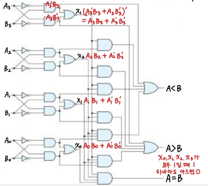 4비트 비교기의 경우 4쌍의 A,B를 비교한다. 아래의 그림에서 x0,x1,x2,x3이 모두 1이면 A = B.