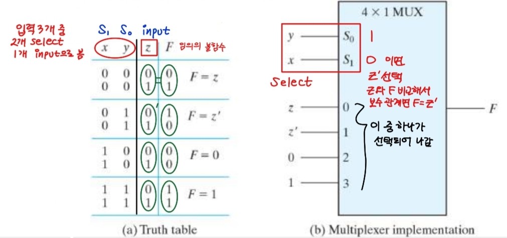 위 그림은 4 to 1 멀티플렉서의 진리표이다. 주어진 진리표에서 입력 x,y는 selective 단자 역할을 하고 z는 기존 입력 역할을 한다. x,y가 각각 0, 1 일 때 z가 f와 같으면 z에 해당되는 0이 출력되고, z가 f와 보수관계이면 z'에 해당되는 1이 출력된다.