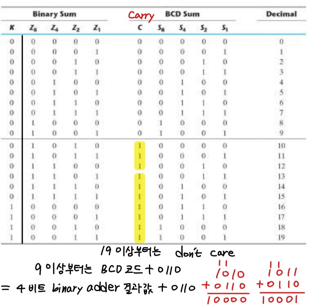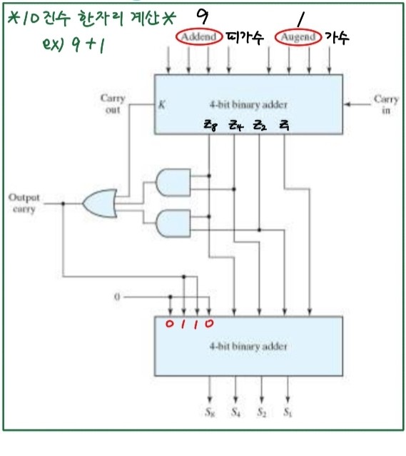 이 때 Sum값이 10 이상이면 캐리가 발생하게 되는데, 이때부터는 BCD코드로 나타기 위해선 binary adder 결과값에 0110을 더해주어야 한다.(BCD코드 + 0110)