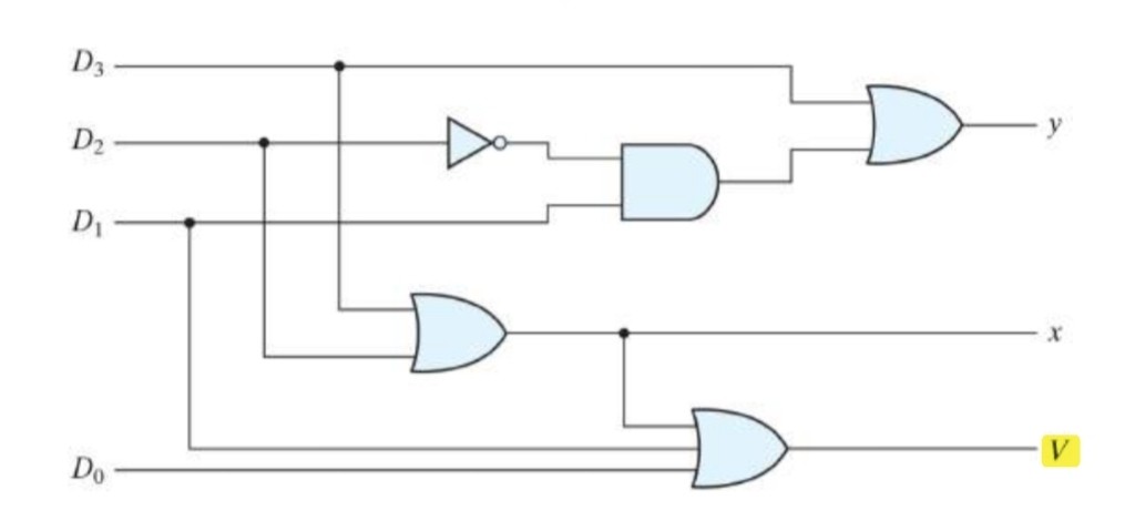 우선순위를 부여한 4 to 2 인코더의 진리표이다. 입력은 4개이고 입력조합은 모두 2^4개이다. 이 때 추가된 출력 v 는 verification의 약자로, v = 0이면 출력이 무효하다. 하지만 v = 1이면 출력이 유효해져, 우선순위에 따라 출력을 매기게 된다.