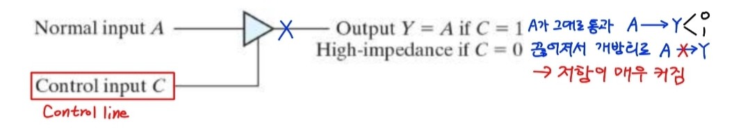 버퍼에서 control line이 추가되었는데, C = 1이면 입력 A가 그대로 출력 Y로 통과된다. 이 때 A가 1이면 Y는 1이고, A가 0이면 Y는 0이다. C = 0이면 입력에서 출력으로 가는 회로가 끊어져 개방회로가 되는데, 이 때 임피던스가 매우 커진다.
