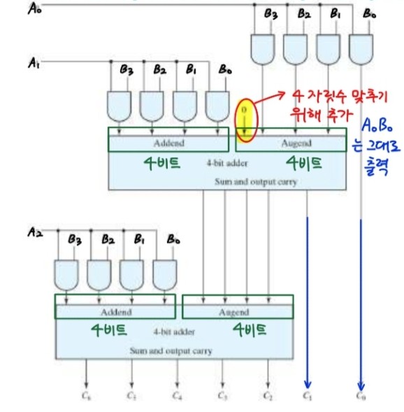 A0B1,A0B0,A1B1,A1B0은 AND게이트로 곱하고 반가산기를 통해 곱셈에서 겹치는 부분을 더해준다.