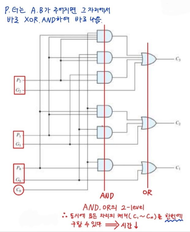 따라서 추가적인 회로의 복잡도가 증가하지만 ,전체 전가산기를 거치지 않으면서 c0~c(i-1)을 구하지 않아도, Ci를 구할 수 있어( = 모든 자리의 캐리를 한번에 구할 수 있다.) 전체 신호 전파시간을 감소시키는 원리이다.