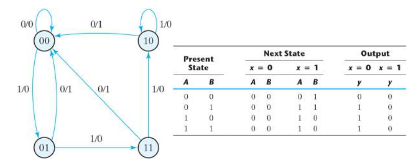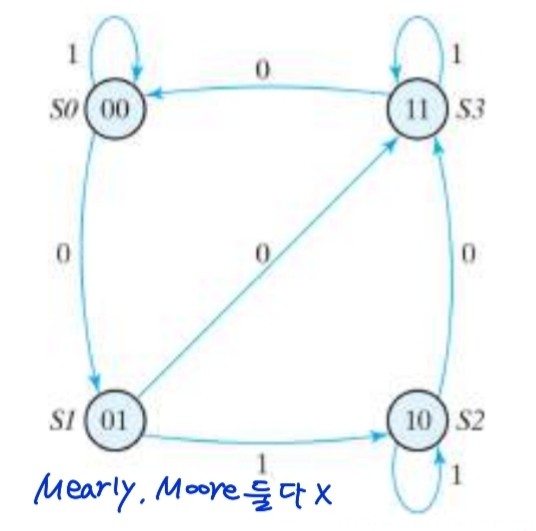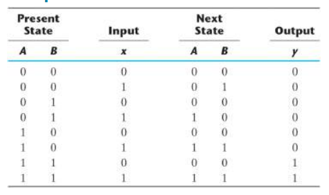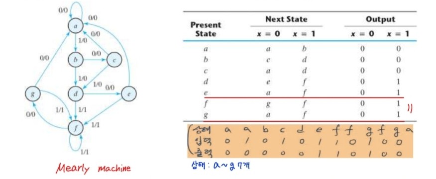 상태표(state table) = 현재상태, 입력, 다음상태, 출력 표기