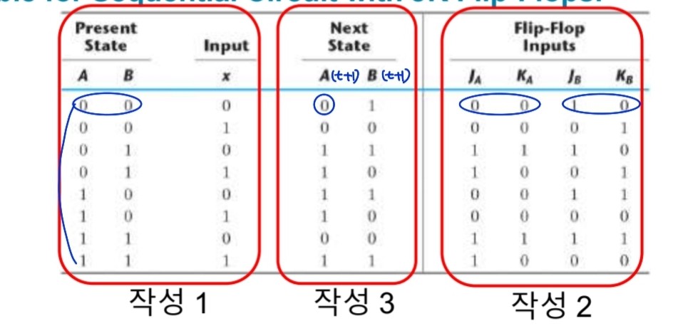 D플립플롭은 상태식과 다음 상태 값이 일치해서 쉽지만 JK나 T 플립플롭은 다음 상태를 얻기 위해 플립플롭에 따른 특성표와 특성식을 참고해야 한다.