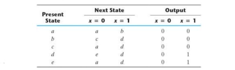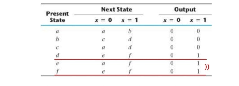 다음 상태표에서 상태는 7개이며 상태 e와 g는 서로 같다. 따라서 g를 삭제하고 g를 모두 e로 변경한다.