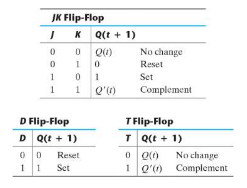 JK F/F, D F/F, T F/F의 특성표와 특성식을 정리하면 다음과 같다.