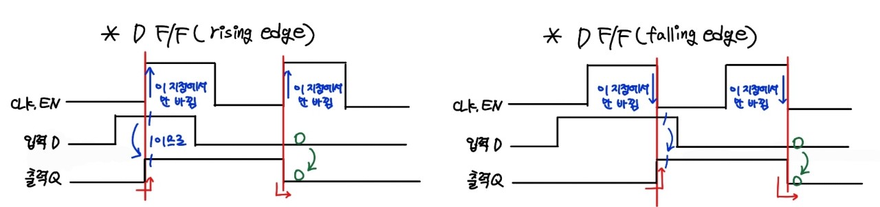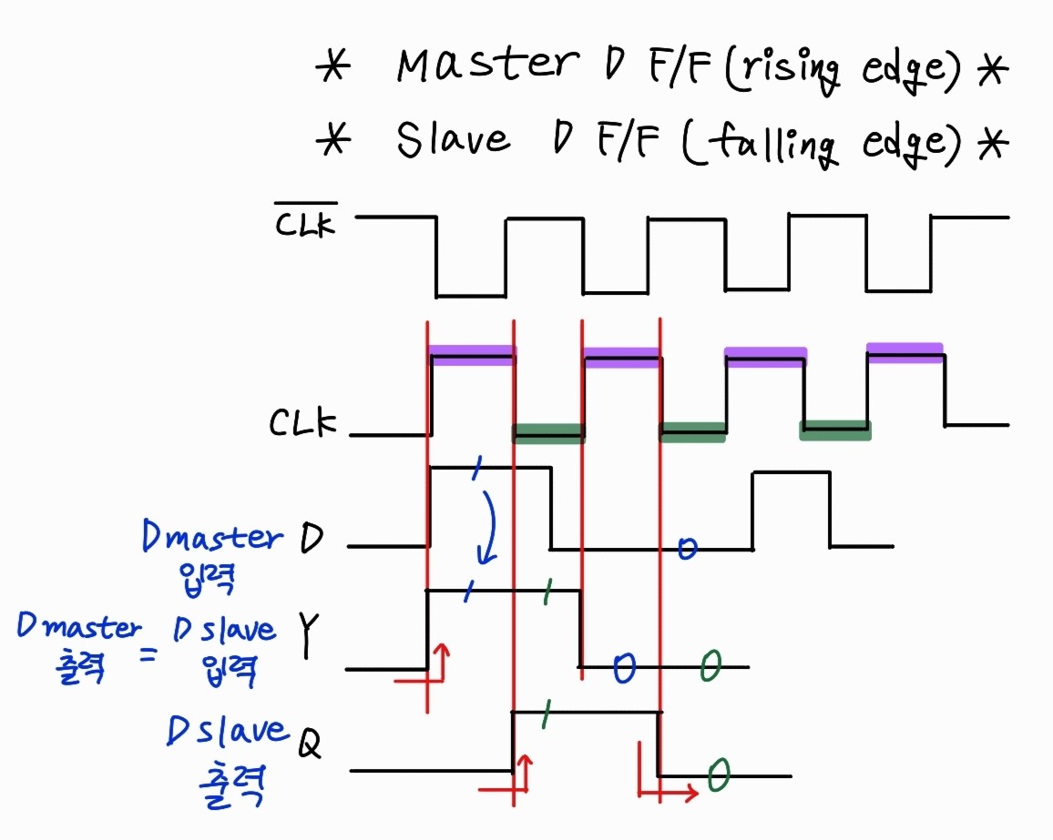 Master D latch는 상승엣지에서 동작하고 Slave D latch는 하강엣지에서 동작한다.