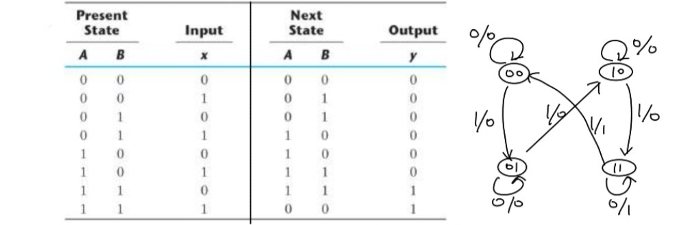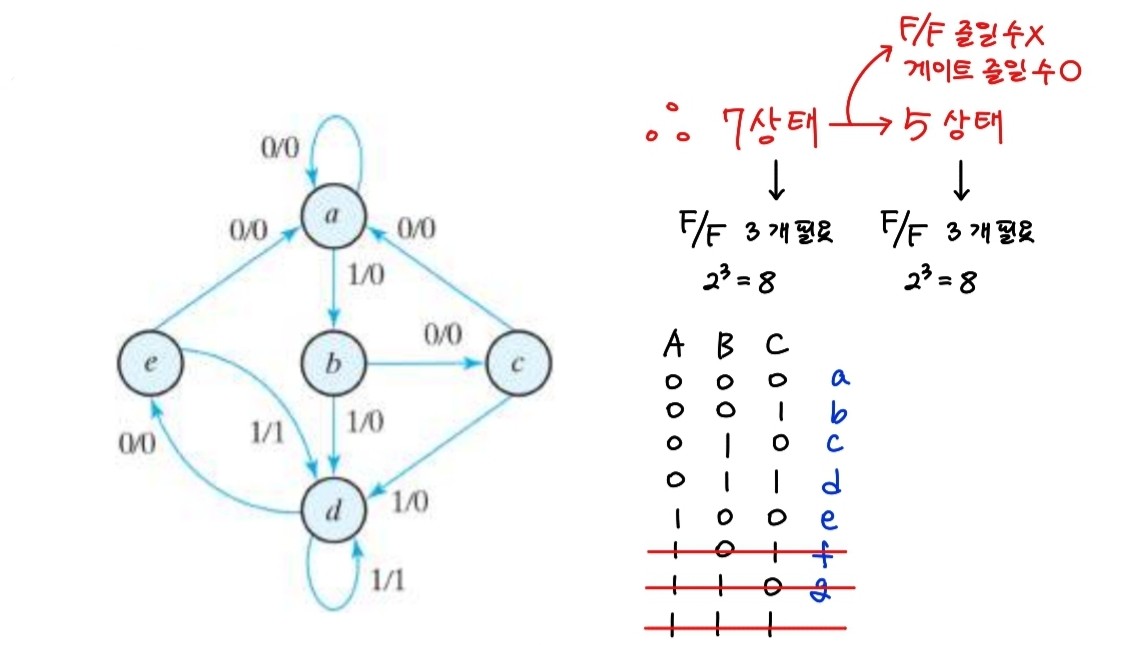 상태축소 : 플립플롭은 1비트를 저장하는 저장장치이고 상태를 저장한다. 따라서 상태축소는 순차회로의 플립플롭 수를 줄이는 것이다. 다만 플립플롭 수를 줄이면 조합게이트가 더 필요할 수 있다. (플립플롭을 줄이는 것이 더 이득)