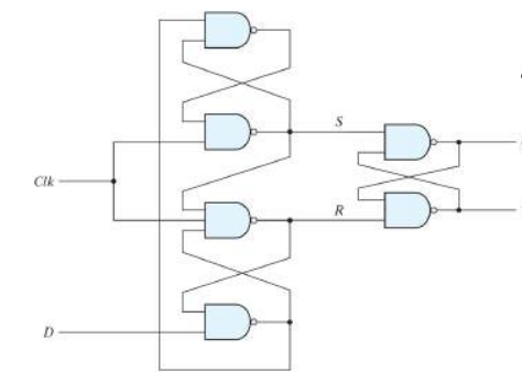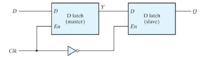 D latch 2개가 이어져 있고 clock입력이 앞의 Master D latch에는 그대로, Slave D latch는 NOT게이트를 통과해 들어간다.