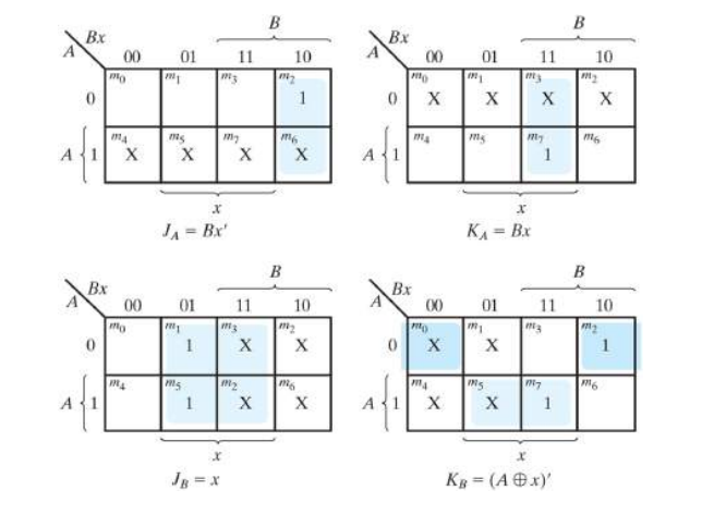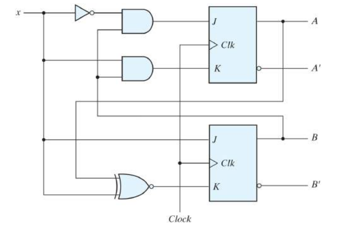 다음 상태의 상태식은 A(T+1) = AB'+AX'+A'BX, B(T+1) = X⊕B
