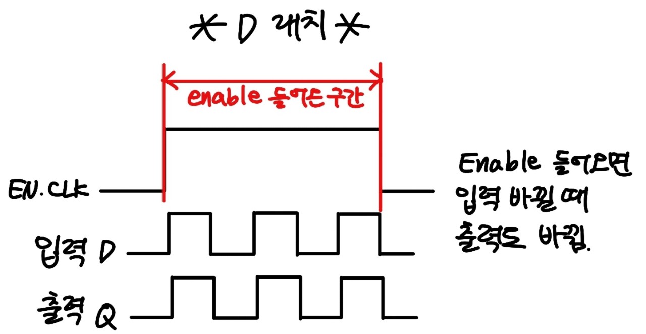D래치는 ENABLE이 들어와 있는 한, 입력(D)이 변경되면 출력(Q)의 상태가 변경되여 저장요소로 사용하게 되면 문제가 발생한다. 따라서 ENABLE이 들어와 있을 때 상승(0>1) 혹은 하강(1>0) 에지에서만 트리거되도록 하는 플립플롭을 사용한다.