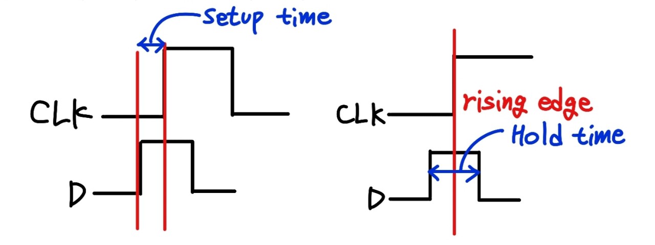 setup time : 클럭천이가 발생하기 전에 입력 D가 일정한 값을 유지해야 하는 최소 시간