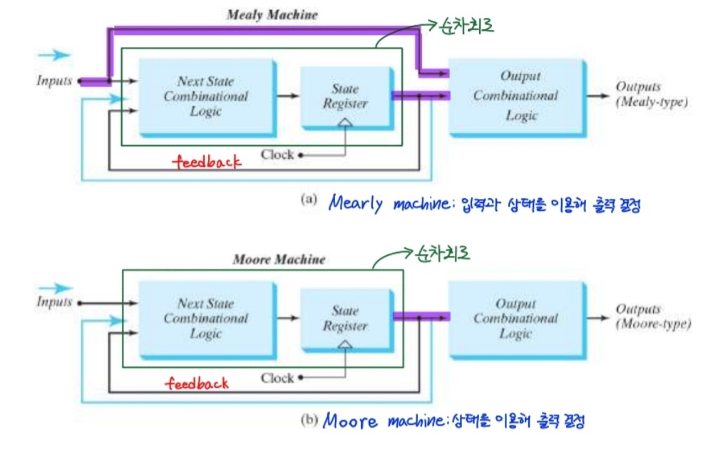 유한 상태머신(finite state machine)의 밀리모델(mearly)과 무어(moore)모델