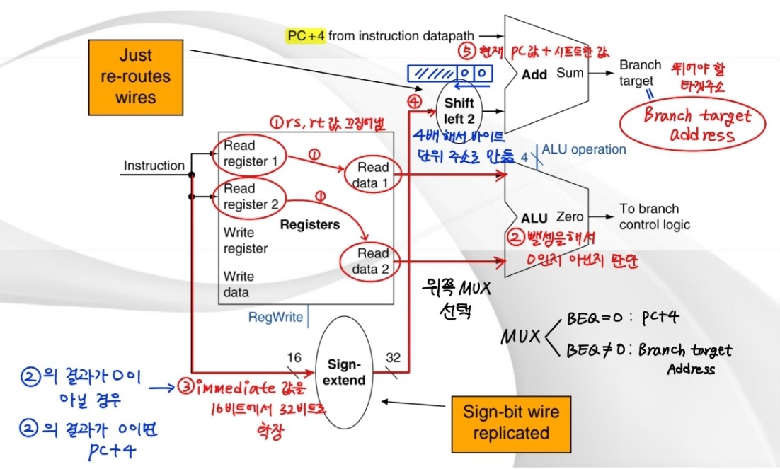 - Branch target address >> 두 레지스터 값을 비교해서 같다면 현재 프로그램 카운터 값과 immediate값을 더해 몇 개의 명령어를 뛰어야 할 지 계산