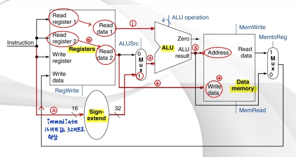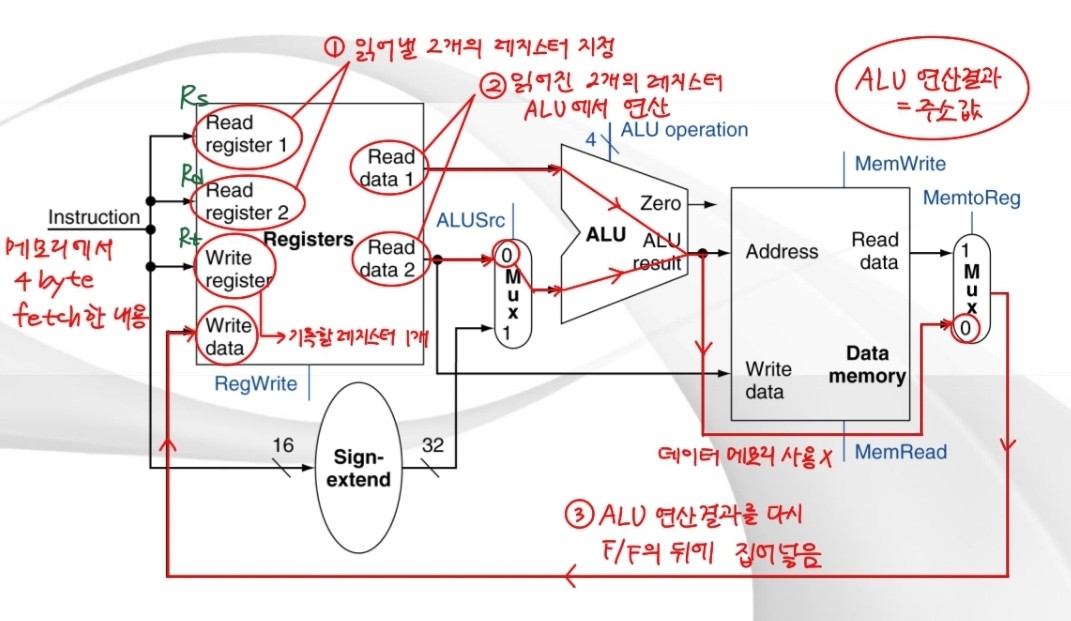 3. 1와 2 를 ALU연산. 이 때 ALU 연산 결과는 store할 주소이다.