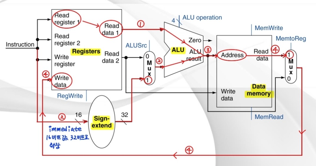 3. 1와 2값을 ALU연산. 이 때 ALU연산 결과는 load할 주소값이다.