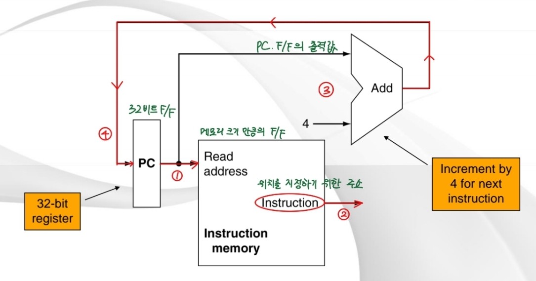 - 프로그램 카운터값은 또한 adder로 가서 4씩 더해져 다시 피드백 회로를 통해 프로그램 카운터의 새로운 입력이 된다.(PC+4). 다음 클럭이 들어오면 프로그램 카운터의 입력으로 새롭게 들어가게 된다.