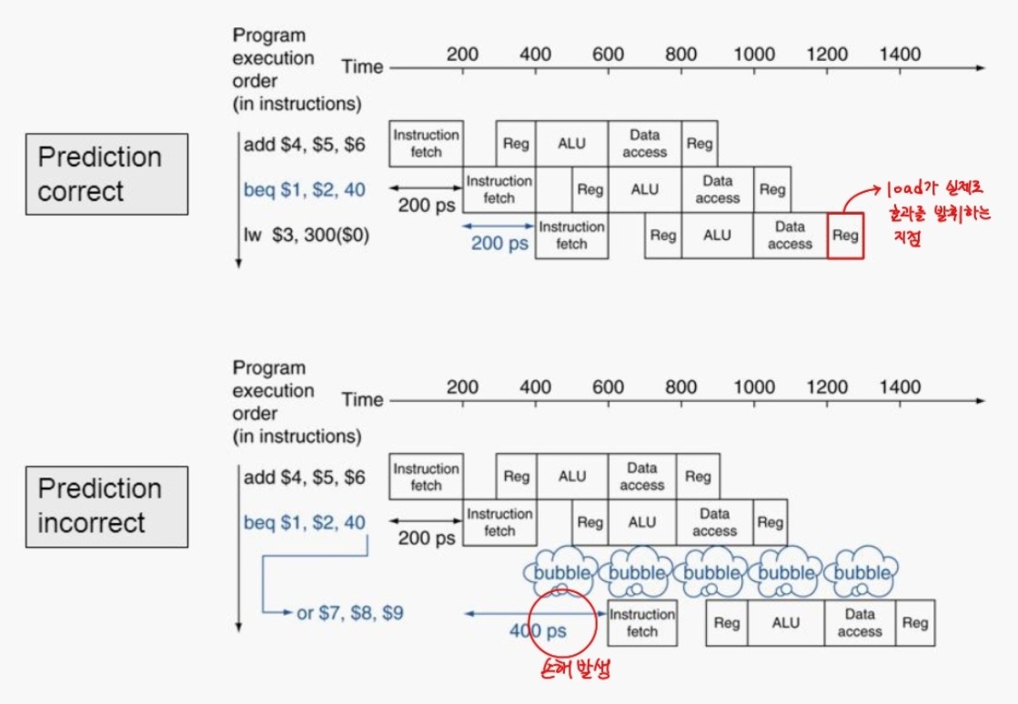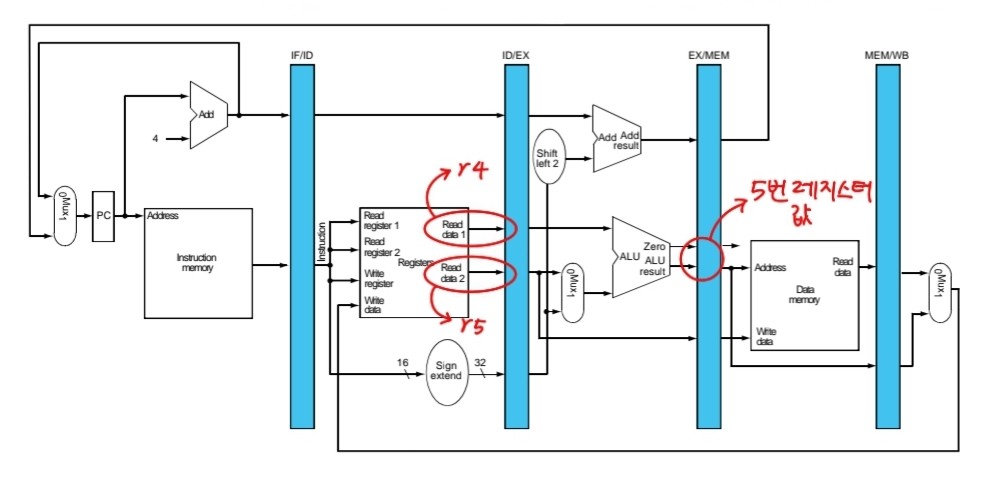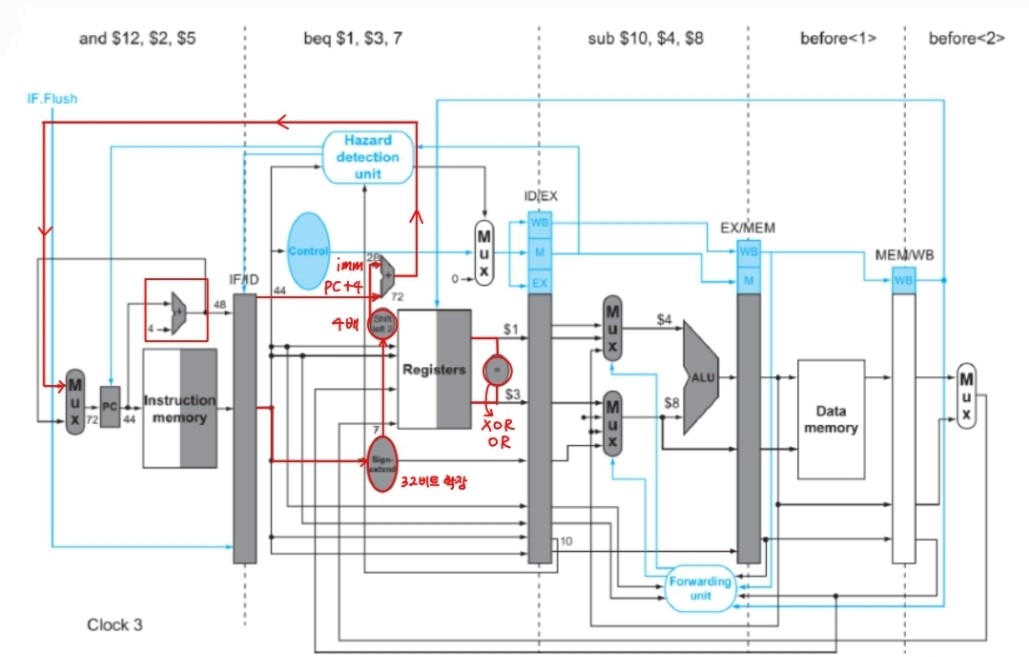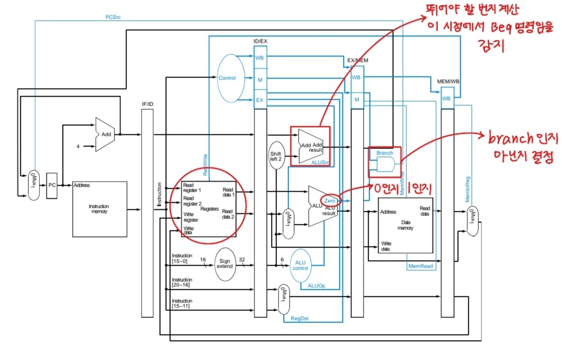 Branch가 생겨서 어떤 명령어로 jump를 해야하는 상황일 때 그 jump를 할지 말지는 ALU의 뺄셈연산(mem파이프라인단계)을 통해 결정된다. Beq명령을 만나고 jump가 일어날 때와 일어나지 않을 때의 레지스터의 위치는 달라진다.