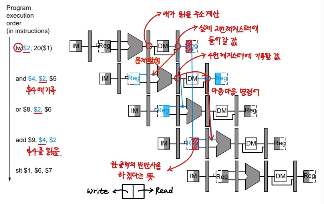 - wirte back stage에 있는 명령어의 값을 다음 명령어의 decode & R-Fetch 단계에 사용해야 하기 때문에 발생하는 해저드