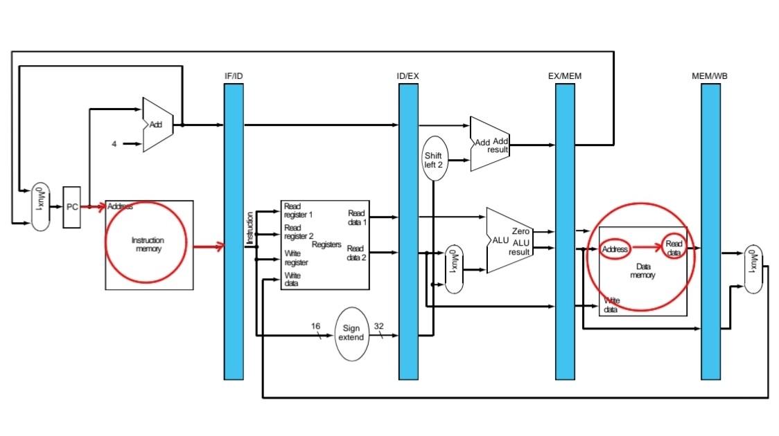 예를 들어 load명령어의 경우, ALU연산을 통해 나온 주소값은 fetch에서 명령어를 읽을 주소를 주고 instruction 4바이트를 출력해야 한다. 그림상에서는 분리된 것 처럼 보이지만 사실 같은 하나의 메모리이다. 이렇게 되면 structure hazard가 발생하게 된다.