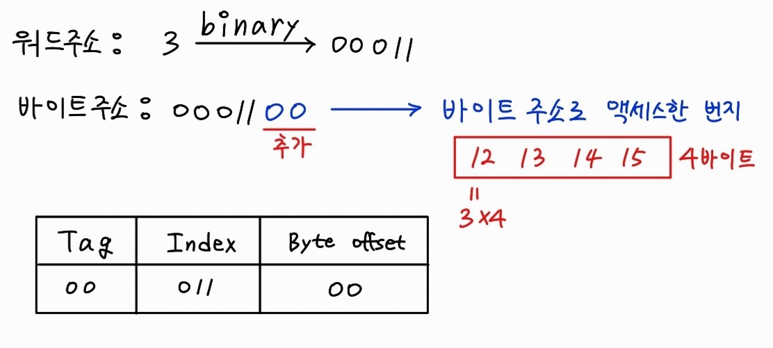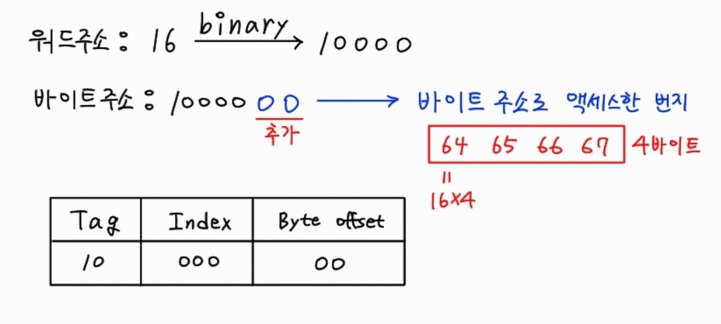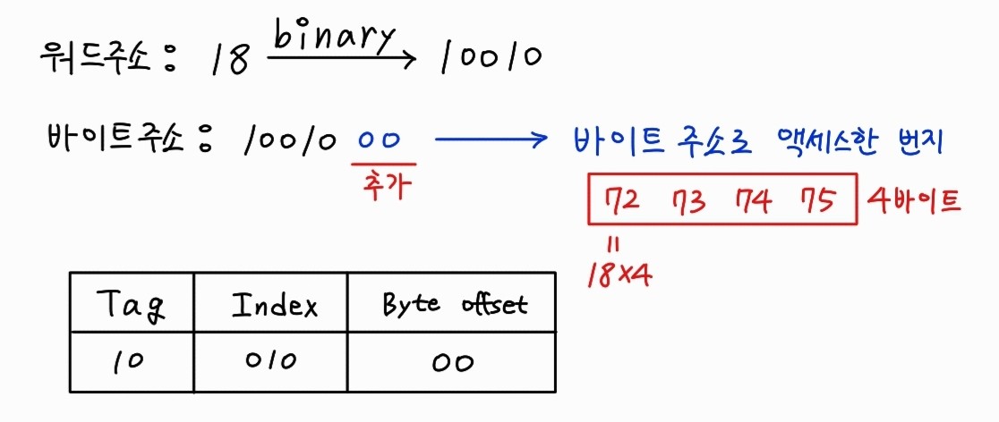 캐시주소는 바이트 단위의 주소를 워드단위로 만들어야 하기 때문에 워드만큼 해당되는 비트를 잘라내고 나머지를 이용해 캐시 인덱스를 생성한다.