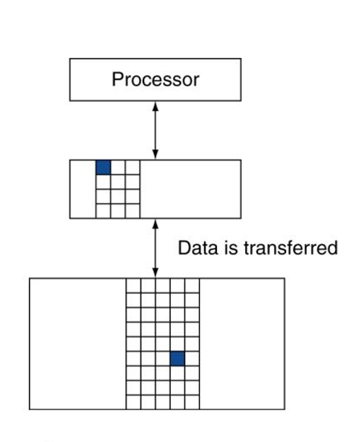 프로세서와 상위레벨 메모리(캐시) 하위레벨 메모리(메인메모리)가 순서대로 계층을 구성하고 있는 모습이다.