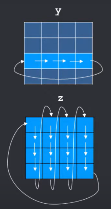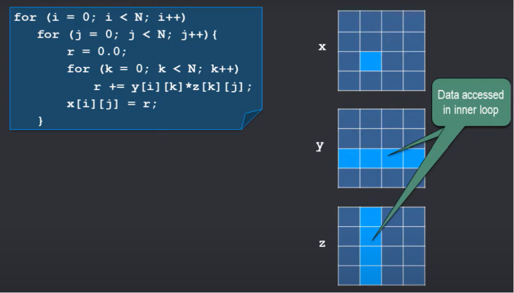 위의 코드는 z matrix의 모든 NXN element를 읽고, y matrix의 한 row에 있는 N번째 element를 반복적으로 읽어서 x matrix의 한 row에 있는 N번째 element에 write하는 작업이다. (y matrix의 i번째 row 와 z matrix의 j번째 column을 곱함)