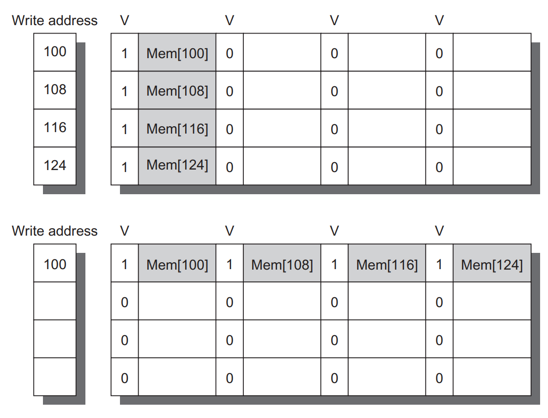 위 write buffer는 4개의 entry로 구성된다. 왼쪽은 entry address이며, 순차적으로 8바이트가 사용중인지를 나타내는 valid bit이 있다. 각 entry는 4개의 64비트 word를 갖는다.