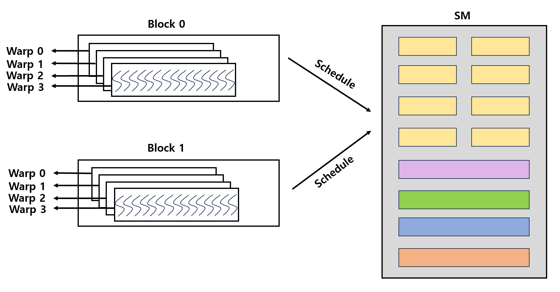 Block과 warp가 SM 및 core에서 schedule되는 방식은 GPU 세대에 따라 구조적으로 다를 수 있다.