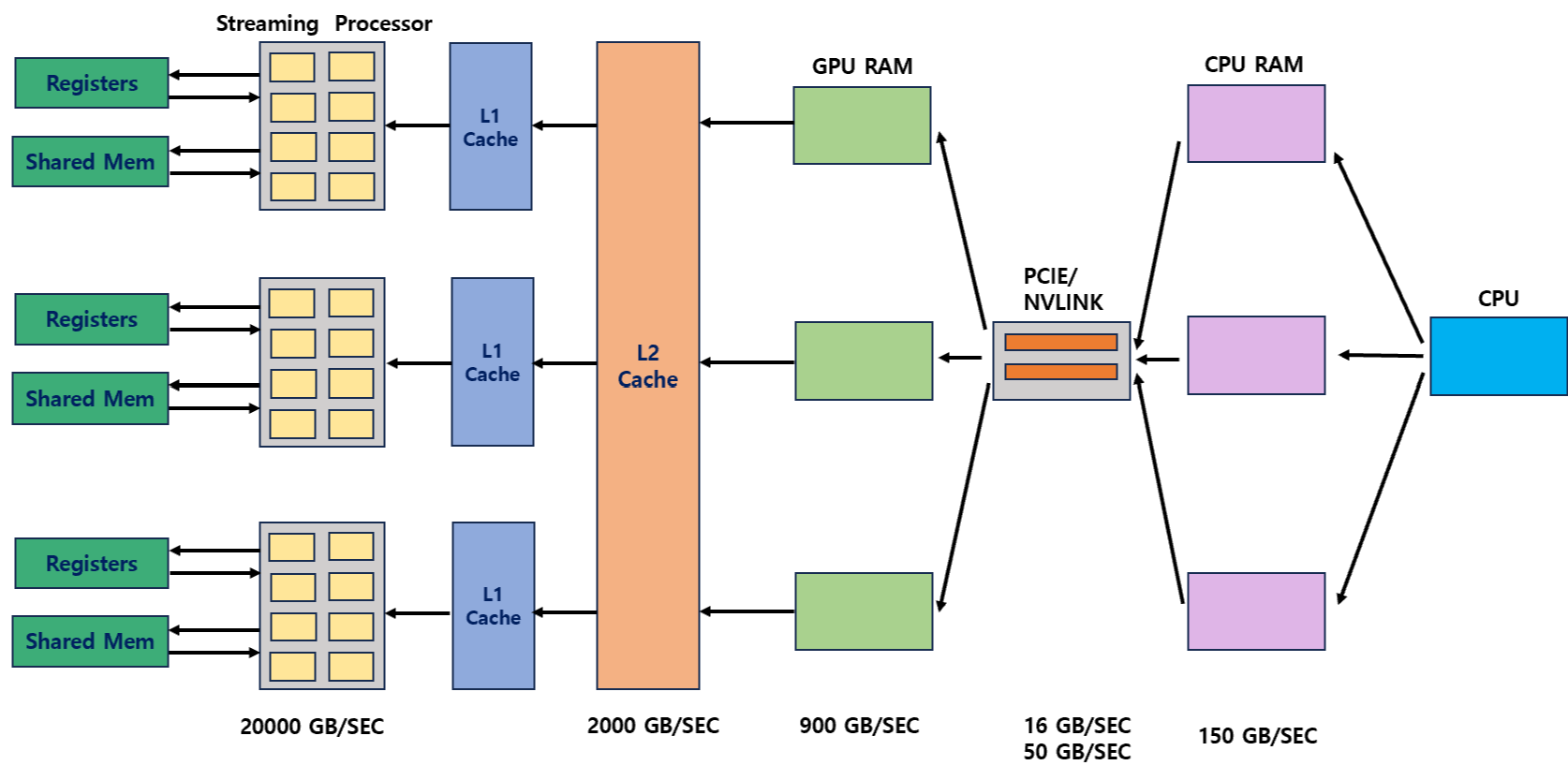 CPU memory에서 출발해 GPU memory를 거쳐 GPU의 SM core에 도달할 때까지 data element가 computation을 위해 통과하는 path는 다음과 같다.