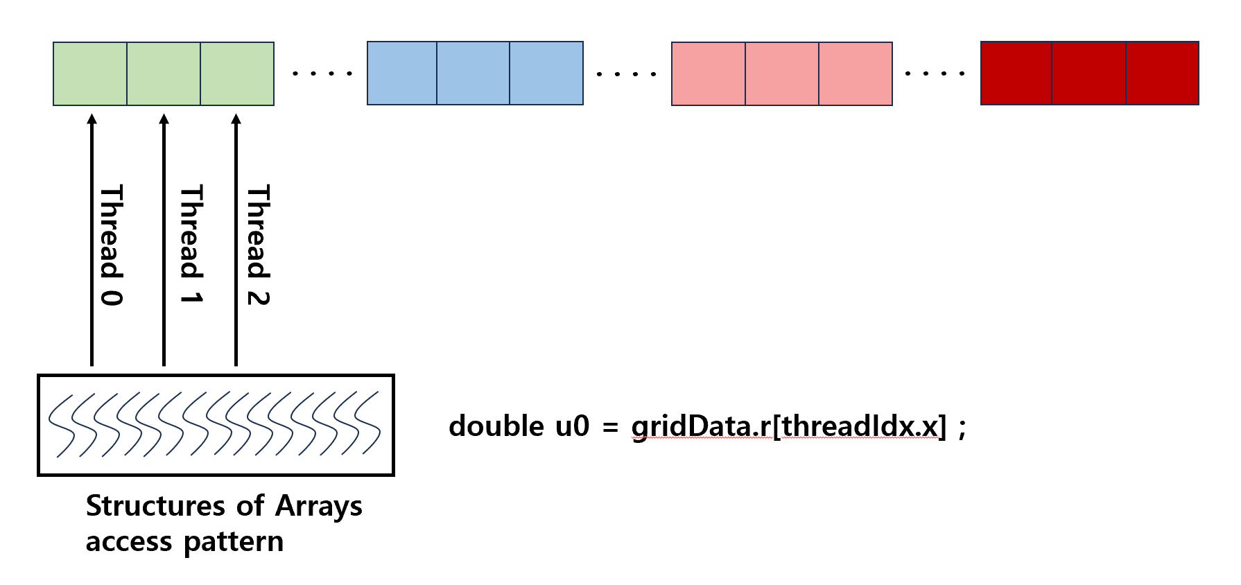 Structures Of Array access pattern : kernel 내 같은 thread에 의해 access 되는 방식이다. coalesced global memory access pattern -> execution 및 memory 효율성을 위해 GPU에서 선호하는 방식