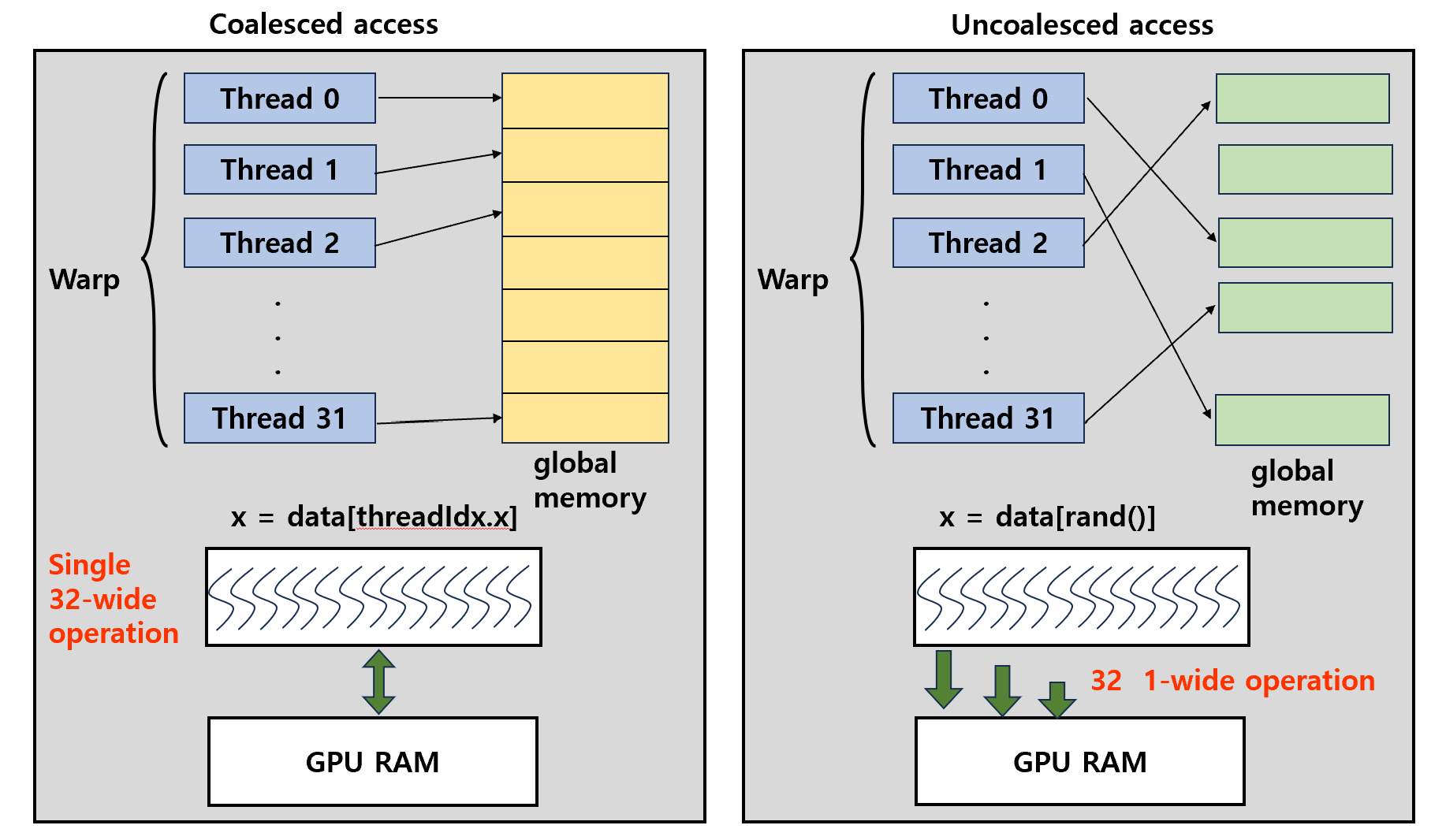 SM에 warp가 할당되고 실행되고 나서 실행되어, global memory로 access될 때, memory를 최적으로 활용하려면 access가 coalesced해야 한다.