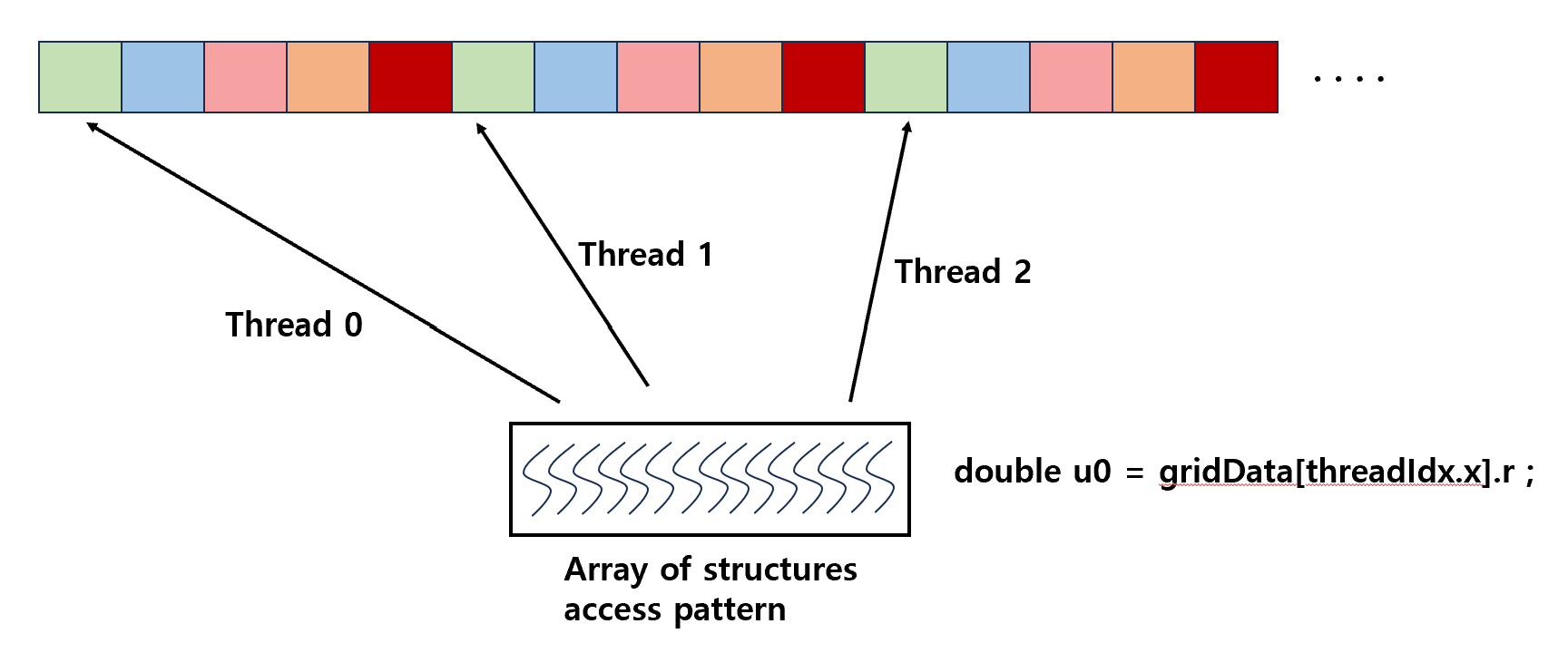 Array Of Structures access pattern : kernel 내 다른 thread에 의해 access 되는 방식이다. -> uncoalesced global memory access pattern -> cache 효율성을 위해 CPU에서 선호하는 방식