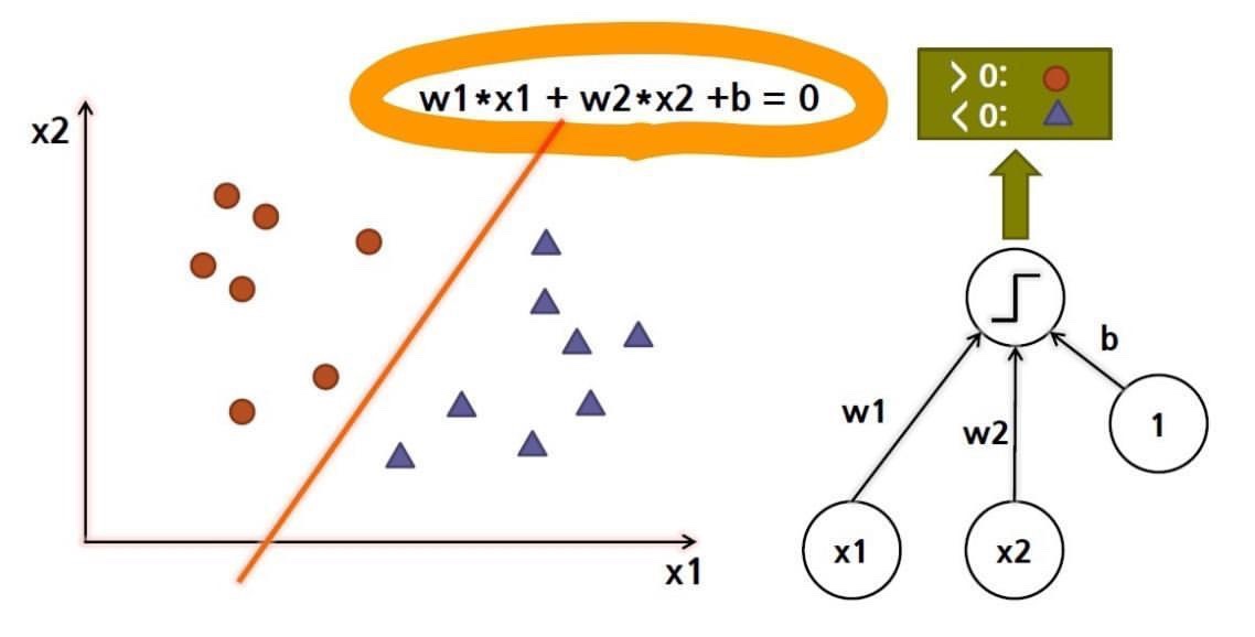 -퍼셉트론의 기하학적 의미 = 두 데이터를 가르는 직선의 방정식 >> 선형 분류 문제를 풀 수 있다
