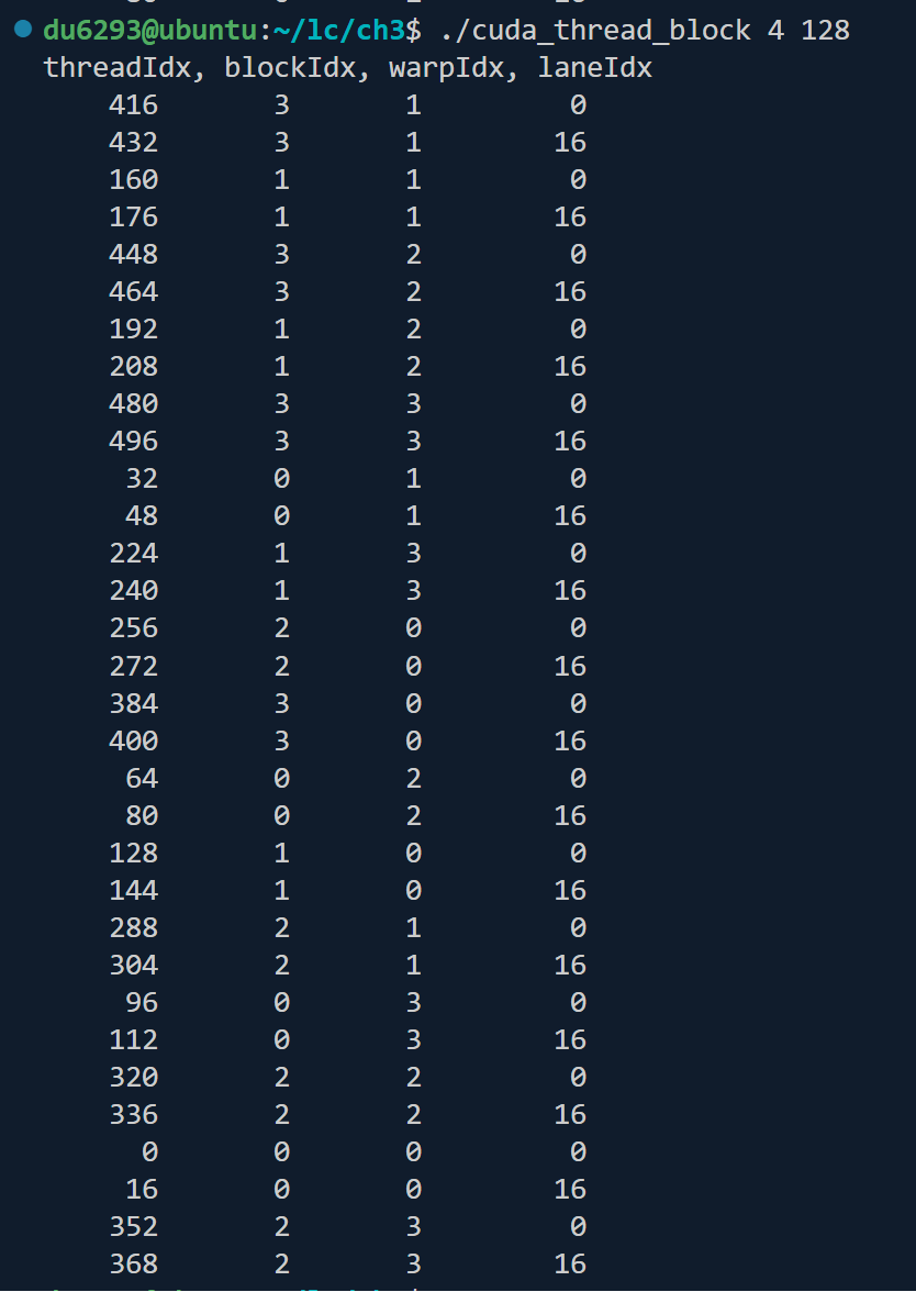 printf(" %5d\t%5d\t %2d\t%2d\n", idx, blockIdx.x, warp_idx, lane_idx);