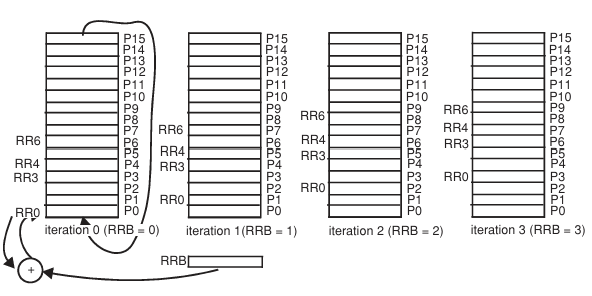 각 iteration에서 rotation regsiter rri는 다른 physical register Pj에 매핑된다.