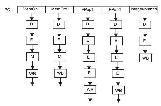 data forwarding이 일어나지 않는다면, 하나의 instruction group은 multiple instruction을 포함하고 fetch - decode - execute 단계를 거친다. 각 instruction은 다른 execution unit으로 dispatch된다.