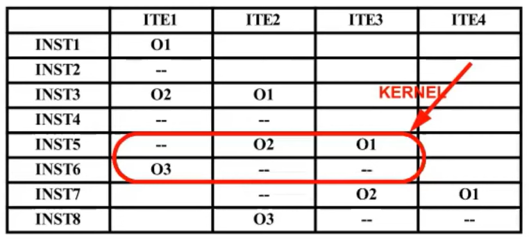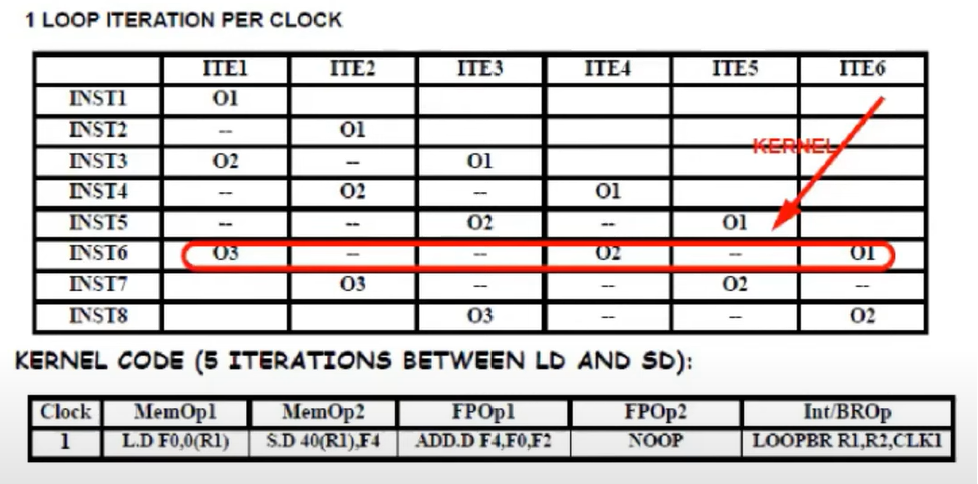 따라서 이 부분을 kernel로 사용한다. kernel 코드는 kernel의 각 operation을 VLIW 명령어의 하나의 slot에 배치하여 얻어진다.