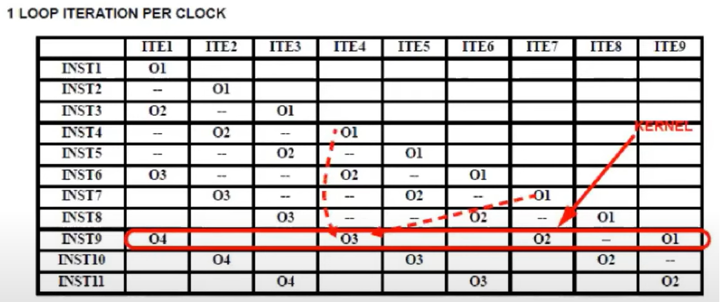 따라서 위와 같은 경우, kernel을 위한 software pipelining이 필요하고 VLIW hardware configuration에 근거해서 kernel의 configuration이 바뀌게 된다.