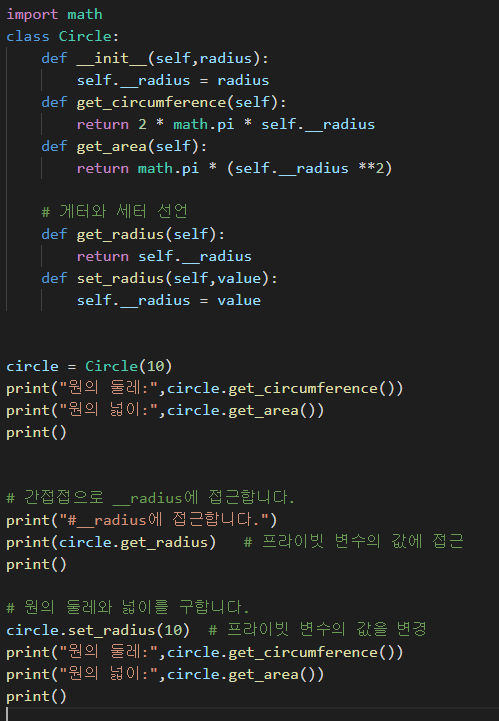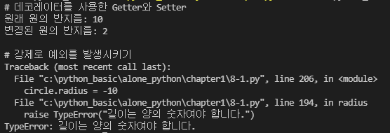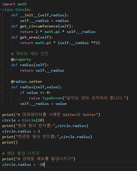 변수 이름과 같은 함수를 정의하고 게터 >> @property, 세터 >> @<변수이름>.setter