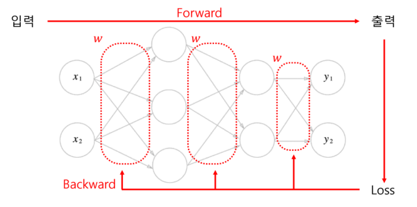 Loss를 바탕으로 각각의 w 하나하나가 얼마나 영향을 주었는지 알아내고, 좀 더 적절한 방향으로 w들을 변경해 나가는 것