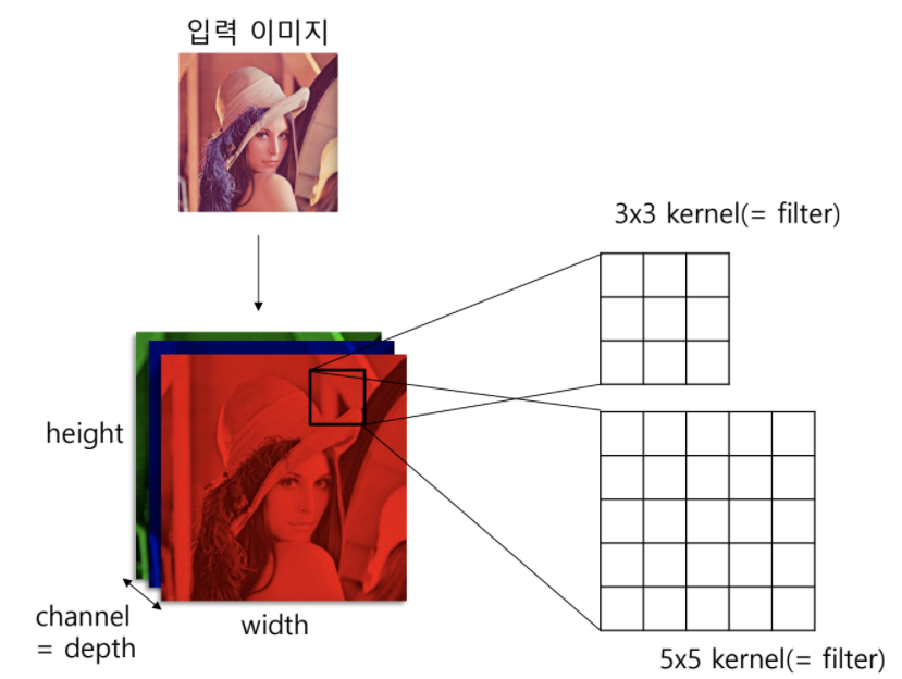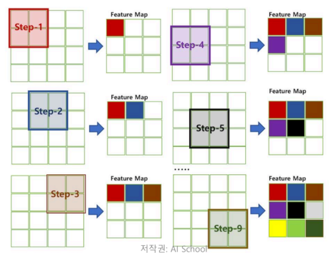 Convolution filter를 목적 이미지 위를 미끄러지듯 움직이며 연산 진행