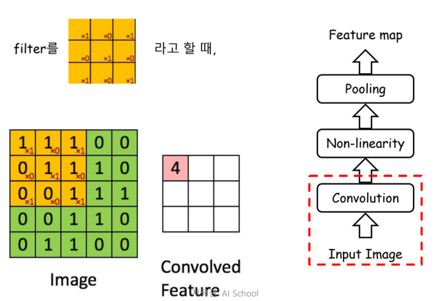Convolution : Filter를 이용해 Local 영역에서의 특징 feature를 얻는 과정