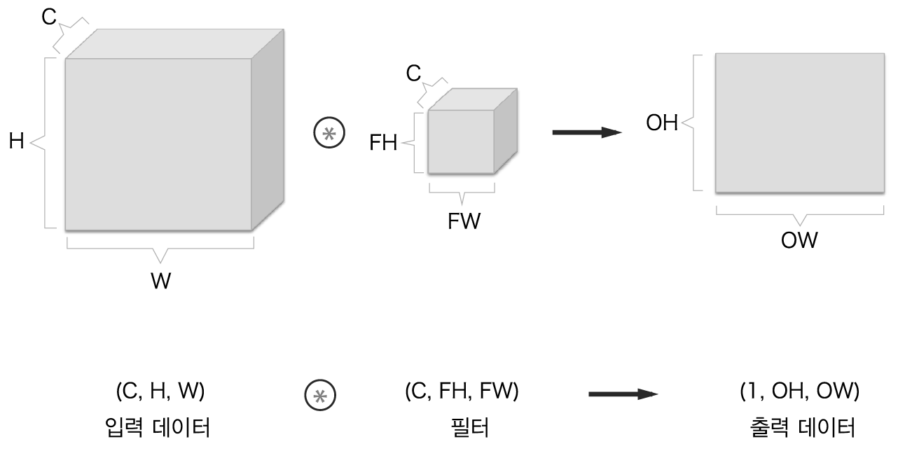 필터 1개 : 입력 필터의 채널은 여러개지만 출력의 채널은 1
