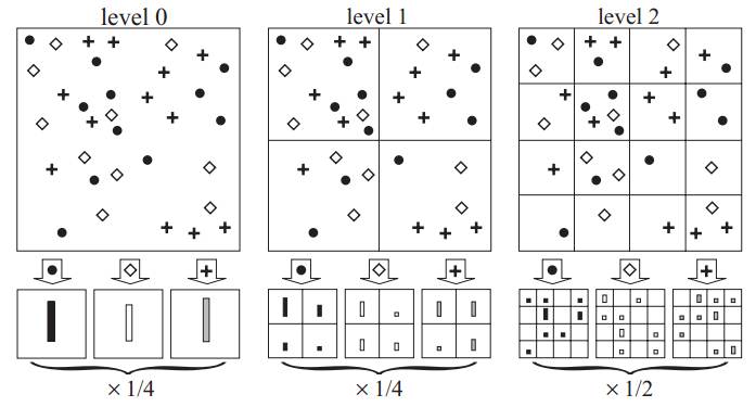 Bag of words방법과는 다르게 추가적으로 이미지를 점진적으로 세분화해 가면서 분할 영역마다 히스토그램을 구해 이것들을 전부 모아 피라미드를 형성하고, 이렇게 형성된 히스토그램 피라미드를 서로 비교하며 두 이지 유사도를 측정하는 방식