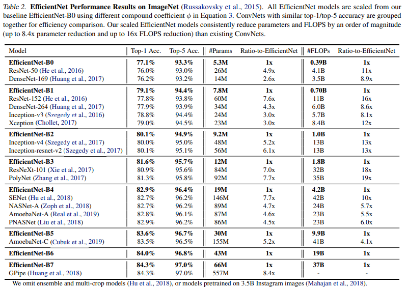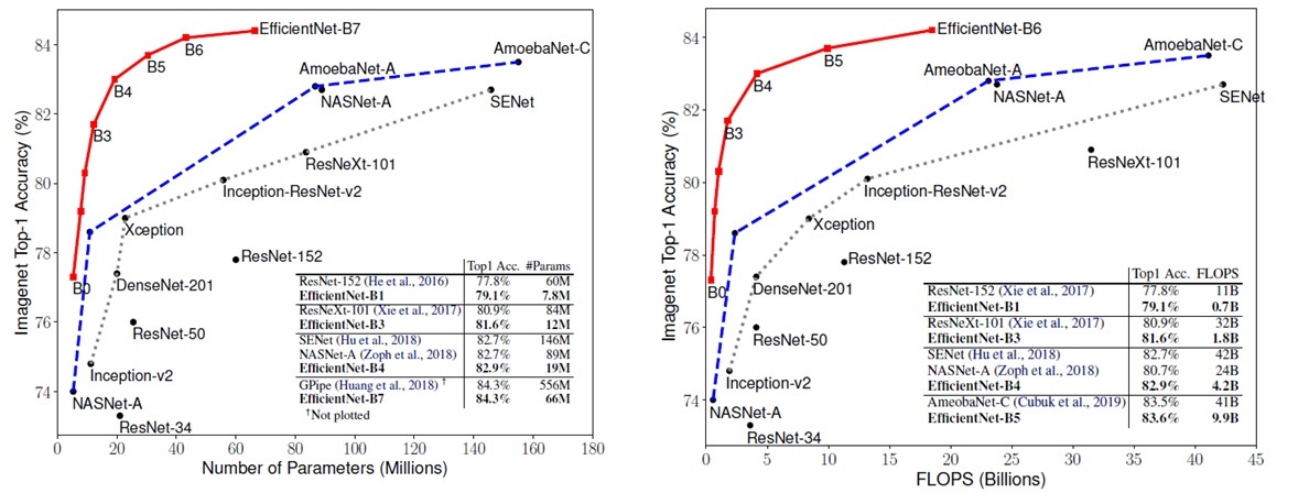한정된 자원을 갖고 있는 상황에서 Depth, Width, Resolution의 balance를 맞추어, 모델의 크기와 연산량을 줄이면서도 성능을 높일 수 있는 방법에서 대한 연구를 수행함으로써 accuracy가 높아졌으며 parameter수와 FLOPS가 더 작아졌다.
