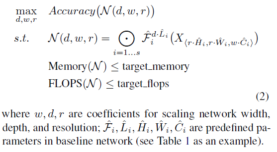 Efficient 논문에서는 compound scailing method 로서, 상수 알파값과 베타, 감마의 제곱값을 2에 근사시키는 조건 하에서 가장 높은 성능을 낼 수 있는 width, depth, resolution 값을 찾도록 하는 식을 설계했다.